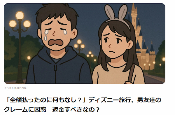 「全額払ったのに何もなし?」ディズニー旅行、男友達のクレームに困惑 返金すべきなの?